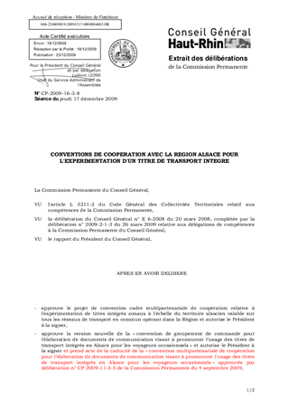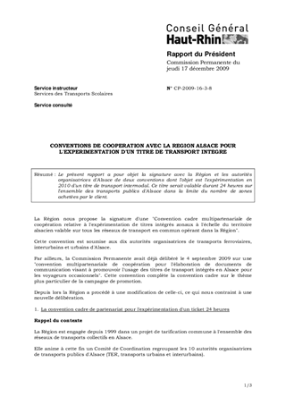 Le présent rapport a pour objet la signature avec la Région et les autorités organisatrices d'Alsace de deux conventions dont l'objet est l'expérimentation en 2010 d'un titre de transport intermodal. Ce titre serait valable durant 24 heures sur l'ensemble des transports publics d'Alsace dans la limite du nombre de zones achetées par le client.