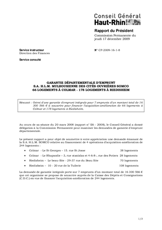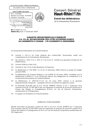 GARANTIE DÉPARTEMENTALE D’EMPRUNT S.A. H.L.M. MULHOUSIENNE DES CITÉS OUVRIÈRES SOMCO 66 LOGEMENTS À COLMAR - 178 LOGEMENTS À RIEDISHEIM