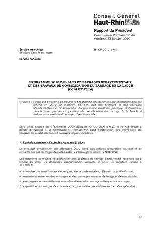 Il vous est proposé d’approuver le programme des dépenses prévisionnelles pour les actions en 2010 de maintien en bon état des retenues et des barrages départementaux et de l'ensemble du patrimoine construit, paysager et écologique associé ainsi que pour l’opération de consolidation du barrage de la Lauch, à réaliser sous maîtrise d’ouvrage départementale.
