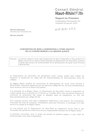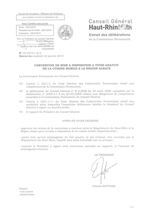 CONVENTION DE MISE A DISPOSITION A TITRE GRATUIT DE LA CUISINE MOBILE A LA REGION ALSACE Resumé Pièces jointes DELIBERATION RAPPORT Assemblée : Commission Permanente Date : 22/01/2010 Rapporteur : Non défini Collectivité : Conseil départemental du Haut-Rhin Direction : Non défini Service : Direction de l'Architecture Domaine : Education Commission : Commission Permanente