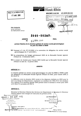 portant fixation de la dotation globale du service social gérontologique du pôle Ill-Ried et Rhin. Resumé Pièces jointes ARRETE Assemblée : Non défini Date : 11/04/2005 Rapporteur : Non défini Collectivité : Conseil départemental du Haut-Rhin Direction : Non défini Service : Service de la Tarification des Etablissements Domaine : Prix de Journée Commission :