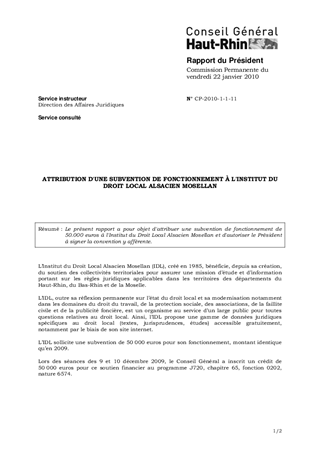 Le présent rapport a pour objet d'attribuer une subvention de fonctionnement de 50.000 euros à l'Institut du Droit Local Alsacien Mosellan et d'autoriser le Président à signer la convention y afférente.
