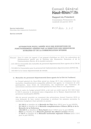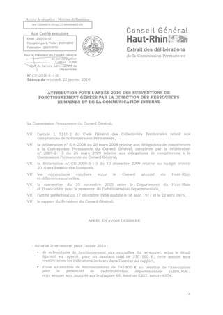 ATTRIBUTION POUR L'ANNEE 2010 DES SUBVENTIONS DE FONCTIONNEMENT GEREES PAR LA DIRECTION DES RESSOURCES HUMAINES ET LA COMMUNICATION INTERNE Resumé Pièces jointes DELIBERATION RAPPORT Assemblée : Commission Permanente Date : 22/01/2010 Rapporteur : Non défini Collectivité : Conseil départemental du Haut-Rhin Direction : Non défini Service : Direction des Ressources Humaines et Dialogue Social Domaine : Commission : Commission Permanente