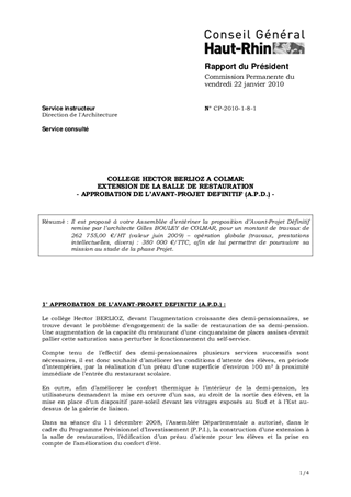 COLLEGE HECTOR BERLIOZ A COLMAR EXTENSION DE LA SALLE DE RESTAURATION - APPROBATION DE L’AVANT-PROJET DEFINITIF (A.P.D.) -