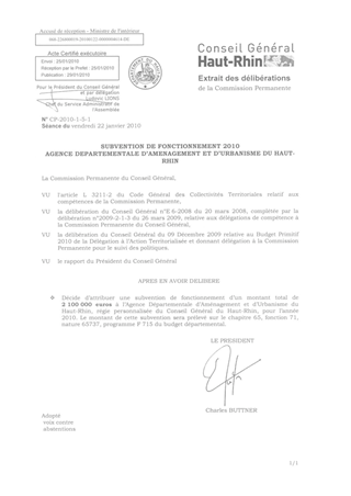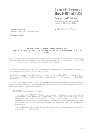 SUBVENTION DE FONCTIONNEMENT 2010 - AGENCE DEPARTEMENTALE D'AMENAGEMENT ET D'URBANISME DU HAUT-RHIN Resumé Pièces jointes DELIBERATION RAPPORT Assemblée : Commission Permanente Date : 22/01/2010 Rapporteur : Non défini Collectivité : Conseil départemental du Haut-Rhin Direction : Non défini Service : Direction à l'Action Territorialisée Domaine : Aménagement du territoire Commission : Commission Permanente