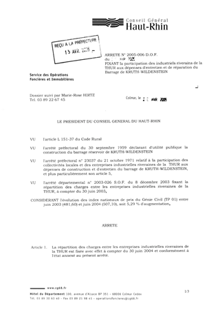 fixant la participation des industriels rivevains de la Thur aux dépenses d'entretien et de réparation du barrage de Kruth-Wildenstein. Resumé Pièces jointes ARRETE Assemblée : Non défini Date : 12/04/2005 Rapporteur : Non défini Collectivité : Conseil départemental du Haut-Rhin Direction : Non défini Service : Service du Patrimoine et du droit des Sols Domaine : Barrages Commission :