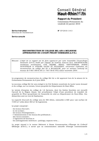 L’objet de ce rapport est de faire approuver par votre Assemblée l’Avant-Projet Sommaire (A.P.S.) établi par l’équipe de maîtrise d’œuvre Kn’L ARCHITECTURE architectes mandataires, CTE, SEDIME, SERAT, GEST’ENERGIE, SCENE ACOUSTIQUE et ATELIER VILLES ET PAYSAGEST, concernant l’opération de reconstruction du collège Bel Air à MULHOUSE, pour un montant estimatif de travaux de 9 861 000 €/HT (11 793 756 €/TTC) valeur novembre 2009.