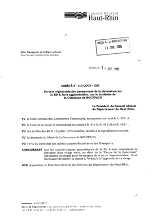 portant réglementation permanente de la circulation sur la DR 8, hors agglomération, sur le territoire de la commune de ROUFFACH. Resumé Pièces jointes ARRETE Assemblée : Non défini Date : 13/04/2005 Rapporteur : Non défini Collectivité : Conseil départemental du Haut-Rhin Direction : Non défini Service : Direction des Routes Domaine : Circulation Commission :