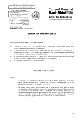 Dans le cadre du Fonds Départemental d'Aide à l'Industrialisation, il est proposé d'accorder une avance de 450 000 € à la Communauté de Communes de la Vallée de Saint-Amarin pour la création d'un bâtiment relais sur le site de la SAIC VELCOREX CONCORD à SAINT-AMARIN sous réserve de la production d'un acte de vente et de l'arrêté d'un plan de redressement de l'activité de l'entreprise.