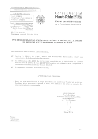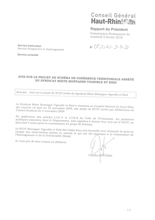 AVIS SUR LE PROJET DE SCHEMA DE COHERENCE TERRITORIALE ARRETE DU SYNDICAT MIXTE MONTAGNE VIGNOBLE ET RIED Resumé Pièces jointes DELIBERATION RAPPORT Assemblée : Commission Permanente Date : 05/02/2010 Rapporteur : Non défini Collectivité : Conseil départemental du Haut-Rhin Direction : Non défini Service : Service Prospective et Aménagement Domaine : Aménagement du territoire Commission : Commission Permanente