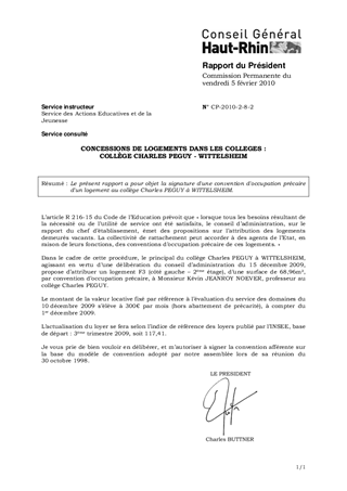 Le présent rapport a pour objet la signature d'une convention d'occupation précaire d'un logement au collège Charles PEGUY à WITTELSHEIM.