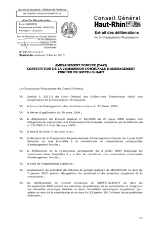 Lors de sa séance du 4 juin 2009, la Commission Départementale d'Aménagement Foncier (CDAF) a donné un avis favorable à la constitution de Commissions Communales d'Aménagement Foncier (CCAF) dans les communes de ASPACH-LE-BAS, BRETTEN, BURNHAUPT-LE-HAUT, ETEIMBES, LUTTERBACH, REININGUE, SCHWEIGHOUSE/THANN, SOPPE-LE-BAS et SOPPE LE-HAUT. Au titre de l'article R. 123-31 du Code Rural, il appartient au Conseil Général de constituer la CCAF de SOPPE LE-HAUT.
