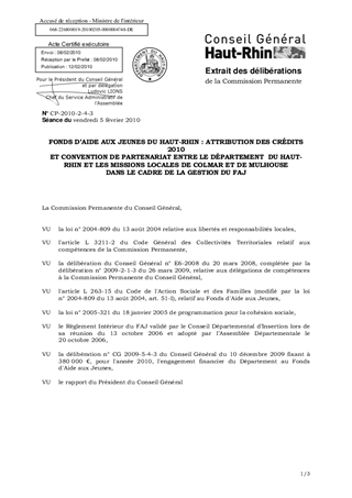 FONDS D’AIDE AUX JEUNES DU HAUT-RHIN : ATTRIBUTION DES CRÉDITS 2010 ET CONVENTION DE PARTENARIAT ENTRE LE DÉPARTEMENT DU HAUT-RHIN ET LES MISSIONS LOCALES DE COLMAR ET DE MULHOUSE DANS LE CADRE DE LA GESTION DU FAJ