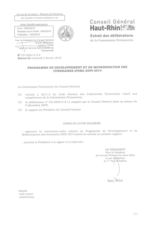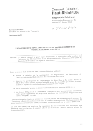 PROGRAMME DE DEVELOPPEMENT ET DE MODERNISATION DES ITINERAIRES(PDMI) 2009-2014 Resumé Pièces jointes DELIBERATION RAPPORT Assemblée : Commission Permanente Date : 05/02/2010 Rapporteur : Non défini Collectivité : Conseil départemental du Haut-Rhin Direction : Non défini Service : Direction des Routes Domaine : Transports / Routes Commission : Commission Permanente