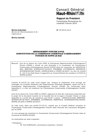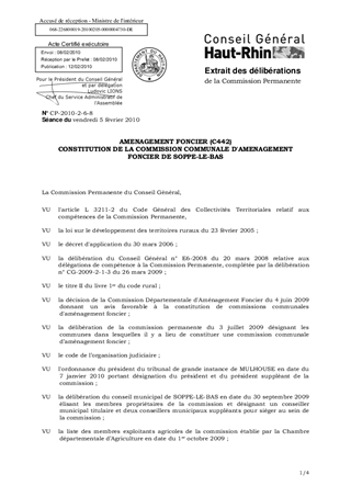Lors de sa séance du 4 juin 2009, la Commission Départementale d'Aménagement Foncier (CDAF) a donné un avis favorable à la constitution de Commissions Communales d'Aménagement Foncier (CCAF) dans les communes de ASPACH-LE-BAS, BRETTEN, BURNHAUPT-LE-HAUT, ETEIMBES, LUTTERBACH, REININGUE, SCHWEIGHOUSE/THANN, SOPPE-LE-BAS et SOPPE LE-HAUT. Au titre de l'article R. 123-31 du Code Rural, il appartient au Conseil Général de constituer la CCAF de SOPPE-LE-BAS.