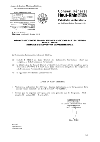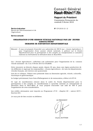 Il vous est proposé d’accorder une subvention de 500 € aux « Jeunes Agriculteurs » pour l’organisation d’une session viticole nationale, à prélever sur le Fonds départemental pour la participation à des congrès ou manifestations à caractère national ou international se déroulant dans le Haut-Rhin.