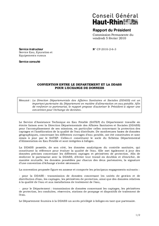 La Direction Départementale des Affaires Sanitaires et Sociales (DDASS) est un important partenaire du Département en matière d'alimentation en eau potable. Afin de renforcer ce partenariat, le rapport propose d'autoriser le Président à signer une convention pour l'échange de données.