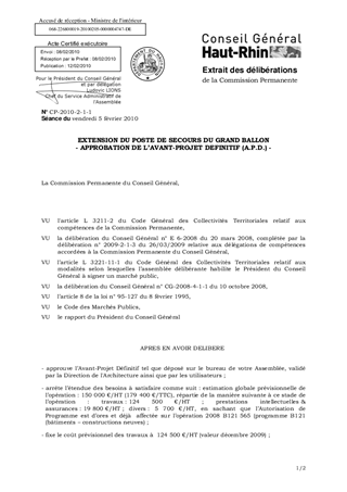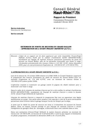 L’objet de ce rapport est de faire approuver par votre Assemblée l’Avant-Projet Définitif (A.P.D.) établi par le cabinet d’architectes ECHO ARCHITECTURE, mandataire de l’équipe de maîtrise d’oeuvre concernant l’extension du poste de secours au Grand Ballon, afin de lui permettre d'accueillir une fraise à neige. L’évaluation prévisionnelle des travaux s’élève à 124 500 €/HT, valeur décembre 2009, pour un coût prévisionnel d’opération de 150 000 €/HT (179 400 €/TTC).