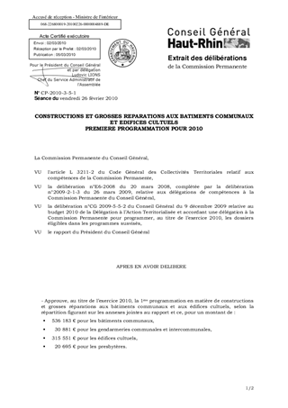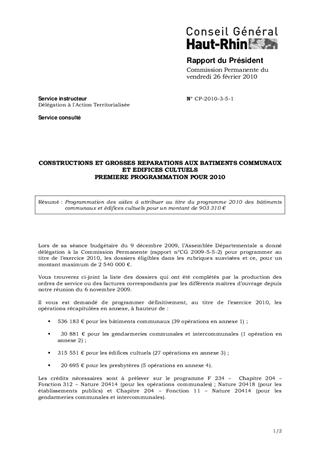 CONSTRUCTIONS ET GROSSES REPARATIONS AUX BATIMENTS COMMUNAUX ET EDIFICES CULTUELS PREMIERE PROGRAMMATION POUR 2010