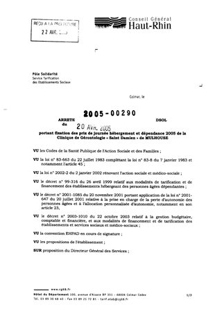 portant fixation des prix de journée hébergement et dépendance 2005 de la clinique de gérontologie "Saint Damien" de MULHOUSE. Resumé Pièces jointes ARRETE Assemblée : Non défini Date : 20/04/2005 Rapporteur : Non défini Collectivité : Conseil départemental du Haut-Rhin Direction : Non défini Service : Service de la Tarification des Etablissements Domaine : Prix de Journée Commission :