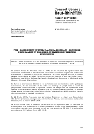 F012 - CONTRIBUTION AU BUREAU ALSACE A BRUXELLES : ORGANISME D'INFORMATION ET DE CONSEIL EN MATIERE DE POLITIQUES EUROPEENNES