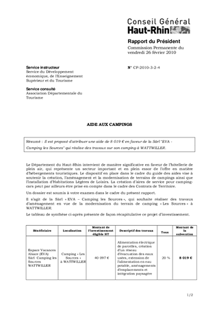 Il est proposé d'attribuer une aide de 8 019 € en faveur de la Sàrl "EVA - Camping les Sources" qui réalise des travaux sur son camping à WATTWILLER.