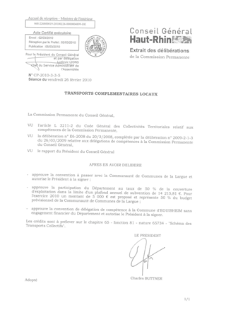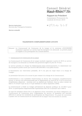 TRANSPORTS COMPLEMENTAIRES LOCAUX Resumé Pièces jointes DELIBERATION RAPPORT Assemblée : Commission Permanente Date : 26/02/2010 Rapporteur : Non défini Collectivité : Conseil départemental du Haut-Rhin Direction : Non défini Service : Service Transports et Déplacements Domaine : Aides / Subventions Commission : Commission Permanente