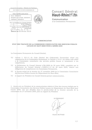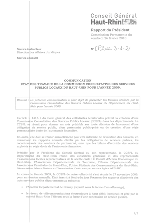 COMMUNICATION ETAT DES TRAVAUX DE LA COMMISSION CONSULTATIVE DES SERVICES PUBLICS LOCAUX DU HAUT RHIN POUR L'ANNEE 2009 Resumé Pièces jointes DELIBERATION RAPPORT Assemblée : Commission Permanente Date : 26/02/2010 Rapporteur : Non défini Collectivité : Conseil départemental du Haut-Rhin Direction : Non défini Service : Service Juridique Domaine : Administration Commission : Commission Permanente