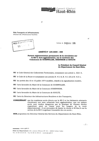 portant réglementation permanente de la circulation sur la RD5, hors agglomération, sur le territoire des communes de Guebwiller, Issenheim et Soultz. Resumé Pièces jointes ARRETE Assemblée : Non défini Date : 02/05/2005 Rapporteur : Non défini Collectivité : Conseil départemental du Haut-Rhin Direction : Non défini Service : Direction des Routes Domaine : Circulation Commission :