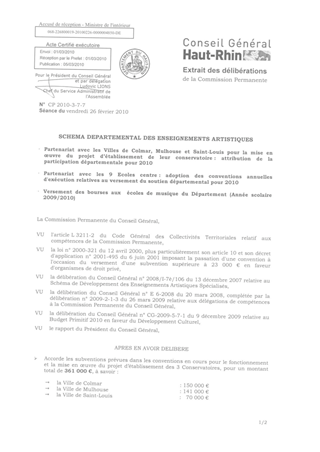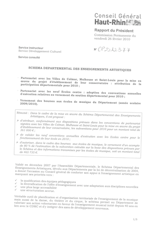 SCHEMA DEPARTEMENTAL DES ENSEIGNEMENTS ARTISTIQUESPARTENARIAT AVEC LES VILLES DE COLMAR, MULHOUSE ET SAINT-LOUIS POUR LA MISE EN ŒUVRE DU PROJET D’ÉTABLISSEMENT DE LEUR CONSERVATOIRE : ATTRIBUTION DE LA PARTICIPATION DÉPARTEMENTALE POUR 2010 PARTENARIAT AVEC LES 9 ECOLES CENTRE : ADOPTION DES CONVENTIONS ANNUELLES D'EXÉCUTION RELATIVES AU VERSEMENT DU SOUTIEN DÉPARTEMENTAL POUR 2010VERSEMENT DES BOURSES AUX ÉCOLES DE MUSIQUE DU DÉPARTEMENT (ANNÉE SCOLAIRE 2009/2010)