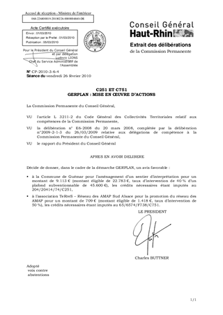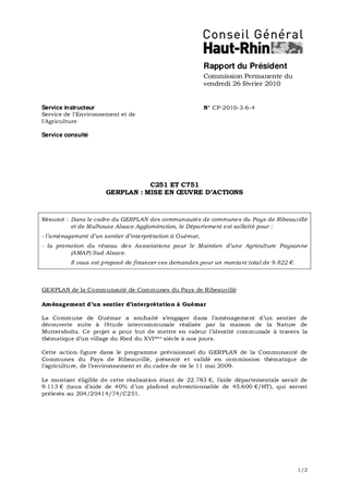 Dans le cadre du GERPLAN des communautés de communes du Pays de Ribeauvillé et de Mulhouse Alsace Agglomération, le Département est sollicité pour : - l’aménagement d’un sentier d’interprétation à Guémar, - la promotion du réseau des Associations pour le Maintien d’une Agriculture Paysanne (AMAP) Sud Alsace. Il vous est proposé de financer ces demandes pour un montant total de 9.822 €.
