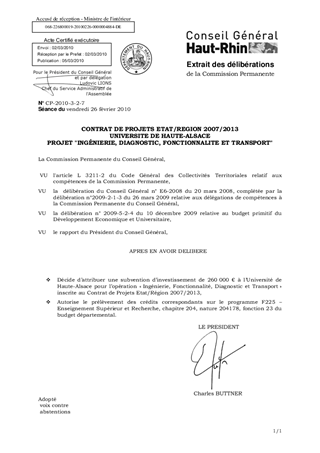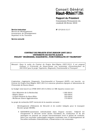 Dans le cadre du Contrat de Projets Etat/Région 2007/2013, il est proposé d'allouer à l'Université de Haute-Alsace une subvention d'investissement de 260 000 € pour le projet "Ingénierie, Diagnostic, Fonctionnalité et Transport".