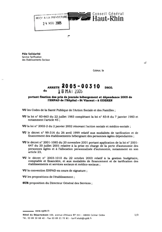 portant fixation des prix de journée hébergement et dépendance 2005 de l'EHPAD de l'Hôpital "Saint Vincent" à Oderen. Resumé Pièces jointes ARRETE Assemblée : Non défini Date : 18/05/2005 Rapporteur : Non défini Collectivité : Conseil départemental du Haut-Rhin Direction : Non défini Service : Service de la Tarification des Etablissements Domaine : Prix de Journée Commission :