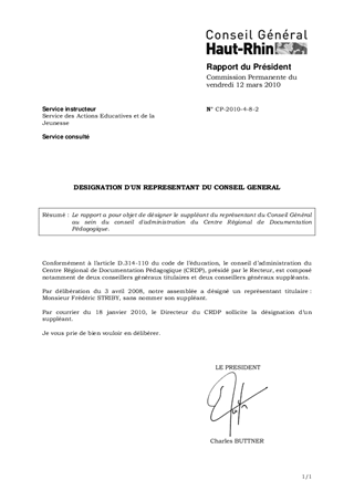 Le rapport a pour objet de désigner le suppléant du représentant du Conseil Général au sein du conseil d'administration du Centre Régional de Documentation Pédagogique.