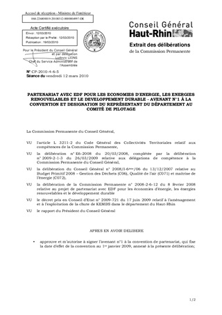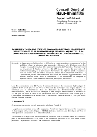 Le Département du Haut-Rhin et EDF mènent en partenariat un programme d’action ambitieux dans le domaine des économies d’énergie, du développement des énergies renouvelables et du développement durable. EDF contribue financièrement au programme à hauteur d’environ 2,3 M€ chaque année. La convention de partenariat adopée par la Commission Permanente du 8 février 2008 nécessite un avenant compte tenu de l'entrée en vigueur tardive de la concession de Kembs. Le Département pourra ainsi bénéficier de 6 mois de recettes supplémentaires. Par ailleurs, comme prévu dans le convention, il est nécessaire de désigner le représentant du Département au comité de pilotage du partenariat.