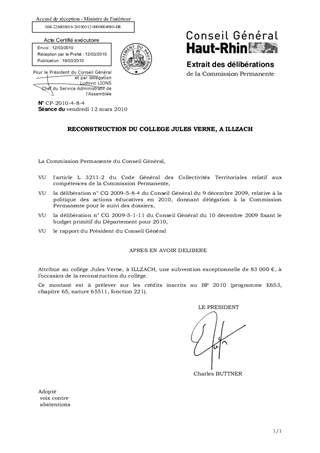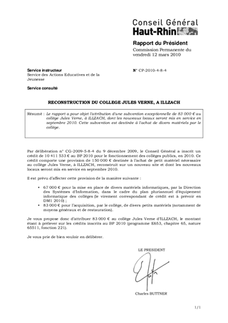 Le rapport a pour objet l'attribution d'une subvention exceptionnelle de 83 000 € au collège Jules Verne, à ILLZACH, dont les nouveaux locaux seront mis en service en septembre 2010. Cette subvention est destinée à l'achat de divers matériels par le collège.