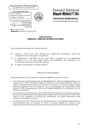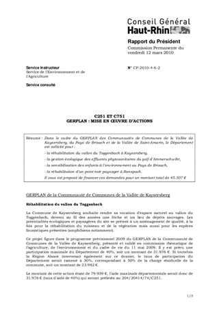 Dans le cadre du GERPLAN des Communautés de Communes de la Vallée de Kaysersberg, du Pays de Brisach et de la Vallée de Saint-Amarin, le Département est sollicité pour : - la réhabilitation du vallon du Toggenbach à Kaysersberg, - la gestion écologique des effluents phytosanitaires du golf d’Ammerschwihr, - la sensibilisation des enfants à l’environnement au Pays de Brisach, - la réhabilitation d’un point noir paysager à Ranspach. Il vous est proposé de financer ces demandes pour un montant total de 45.507 €
