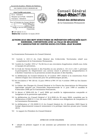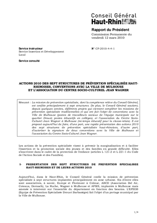 ACTIONS 2010 DES SEPT STRUCTURES DE PRÉVENTION SPÉCIALISÉE HAUT-RHINOISES, CONVENTIONS AVEC LA VILLE DE MULHOUSE ET L’ASSOCIATION DU CENTRE SOCIO-CULTUREL JEAN WAGNER