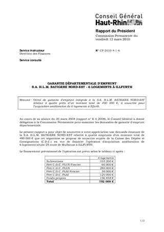 GARANTIE DÉPARTEMENTALE D'EMPRUNT S.A. H.L.M. BATIGERE NORD-EST - 6 LOGEMENTS À ILLFURTH