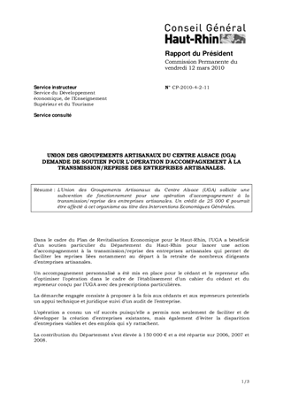 L'Union des Groupements Artisanaux du Centre Alsace (UGA) sollicite une subvention de fonctionnement pour une opération d'accompagnement à la transmission/reprise des entreprises artisanales. Un crédit de 25 000 € pourrait être affecté à cet organisme au titre des Interventions Economiques Générales.