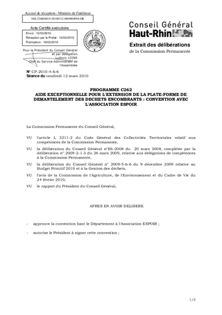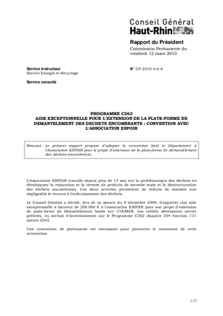 PROGRAMME C262 AIDE EXCEPTIONNELLE POUR L'EXTENSION DE LA PLATE-FORME DE DEMANTELEMENT DES DECHETS ENCOMBRANTS : CONVENTION AVEC L'ASSOCIATION ESPOIR