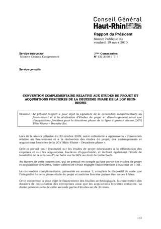 Le présent rapport a pour objet la signature de la convention complémentaire au financement et à la réalisation d’études de projet et d’aménagement ainsi que d’acquisitions foncières pour la deuxième phase de la ligne à grande vitesse (LGV) Rhin-Rhône – Branche Est.