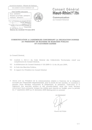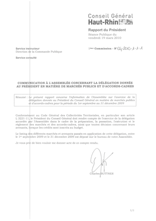 COMMUNICATION A L'ASSEMBLEE CONCERNANT LA DELEGATION DONNEE AU PRESIDENT EN MATIERE DE MARCHES PUBLICS ET D'ACCORDS-CADRES. Resumé Pièces jointes DELIBERATION RAPPORT Assemblée : Conseil General Date : 19/03/2010 Rapporteur : Non défini Collectivité : Conseil départemental du Haut-Rhin Direction : Non défini Service : Service de la Commande Publique Domaine : Administration Commission : Assemblée Départementale