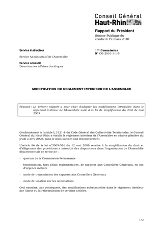 Le présent rapport a pour objet d'adopter les modifications introduites dans le règlement intérieur de l'Assemblée suite à la loi de simplification du droit de mai 2009.