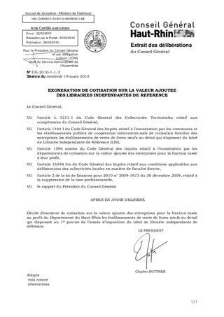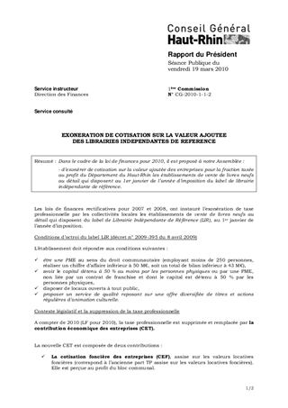 Dans le cadre de la loi de finances pour 2010, il est proposé à notre Assemblée : - d’exonérer de cotisation sur la valeur ajoutée des entreprises pour la fraction taxée au profit du Département du Haut-Rhin les établissements de vente de livres neufs au détail qui disposent au 1er janvier de l’année d’imposition du label de librairie indépendante de référence.