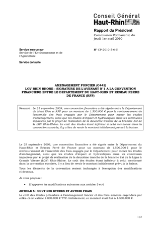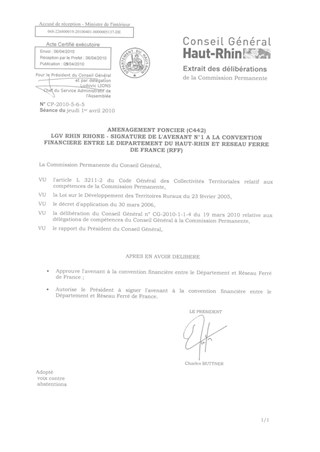 AMENAGEMENT FONCIER (C442)LGV RHIN RHONE - SIGNATURE DE L'AVENANT N°1 A LA CONVENTION FINANCIERE ENTRE LE DEPARTEMENT DU HAUT-RHIN ET RESEAU FERRE DE FRANCE (RFF)