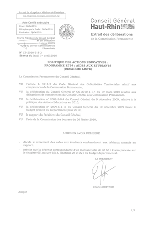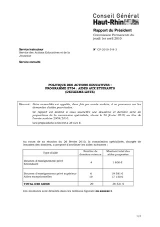 Notre assemblée est appelée, deux fois par année scolaire, à se prononcer sur les demandes d'aides pour études. Ce rapport est destiné à vous soumettre une deuxième et dernière série de propositions de la commission spécialisée, réunie le 26 février 2010, au titre de l'année scolaire 2009/2010. Ces propositions s'élèvent à 38 531 €.