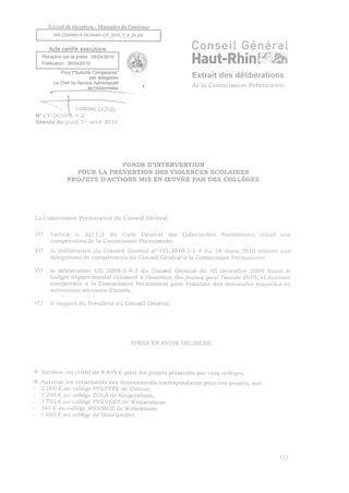 Le Fonds d'Intervention pour la prévention des Violences Scolaires est un dispositif doté de 30 000 € en 2010, destiné à encourager et à soutenir des projets d'actions mis en œuvre dans et aux abords des collèges afin de prévenir les violences scolaires et les incivilités. Dans ce cadre, les collèges de Colmar (Pfeffel), de Kingersheim (Zola), de Wintzenheim (Prévert), de Wittelsheim (Mermoz) et de Mulhouse (Bourtzwiller) présentent chacun des projets, pour un montant total de 8 849 €. Il est proposé d'autoriser, pour les actions présentées, le versement des financements correspondants aux collèges porteurs de projets.