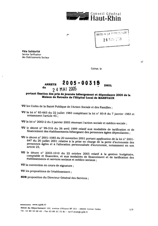 portant fixation des prix de journée hébergement et dépendance 2005 de la maison de retraite de l'hôpital local de Masevaux. Resumé Pièces jointes ARRETE Assemblée : Non défini Date : 24/05/2005 Rapporteur : Non défini Collectivité : Conseil départemental du Haut-Rhin Direction : Non défini Service : Service de la Tarification des Etablissements Domaine : Prix de Journée Commission :