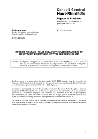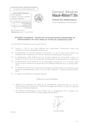 INFOBEST PALMRAIN - SOLDE DE LA PARTICIPATION FINANCIÈRE DU DÉPARTEMENT DU HAUT-RHIN AU TITRE DE L'EXERCICE 2009